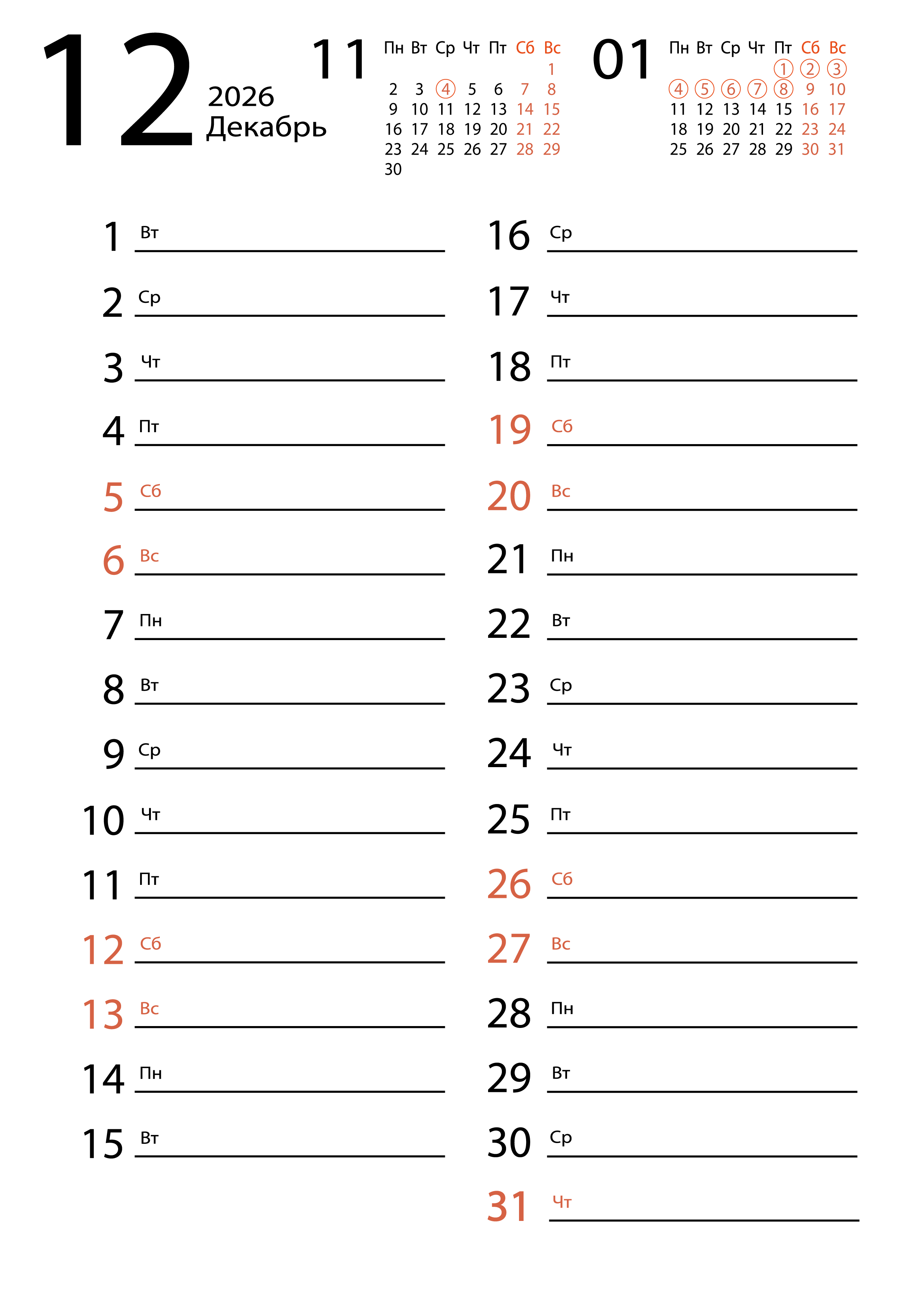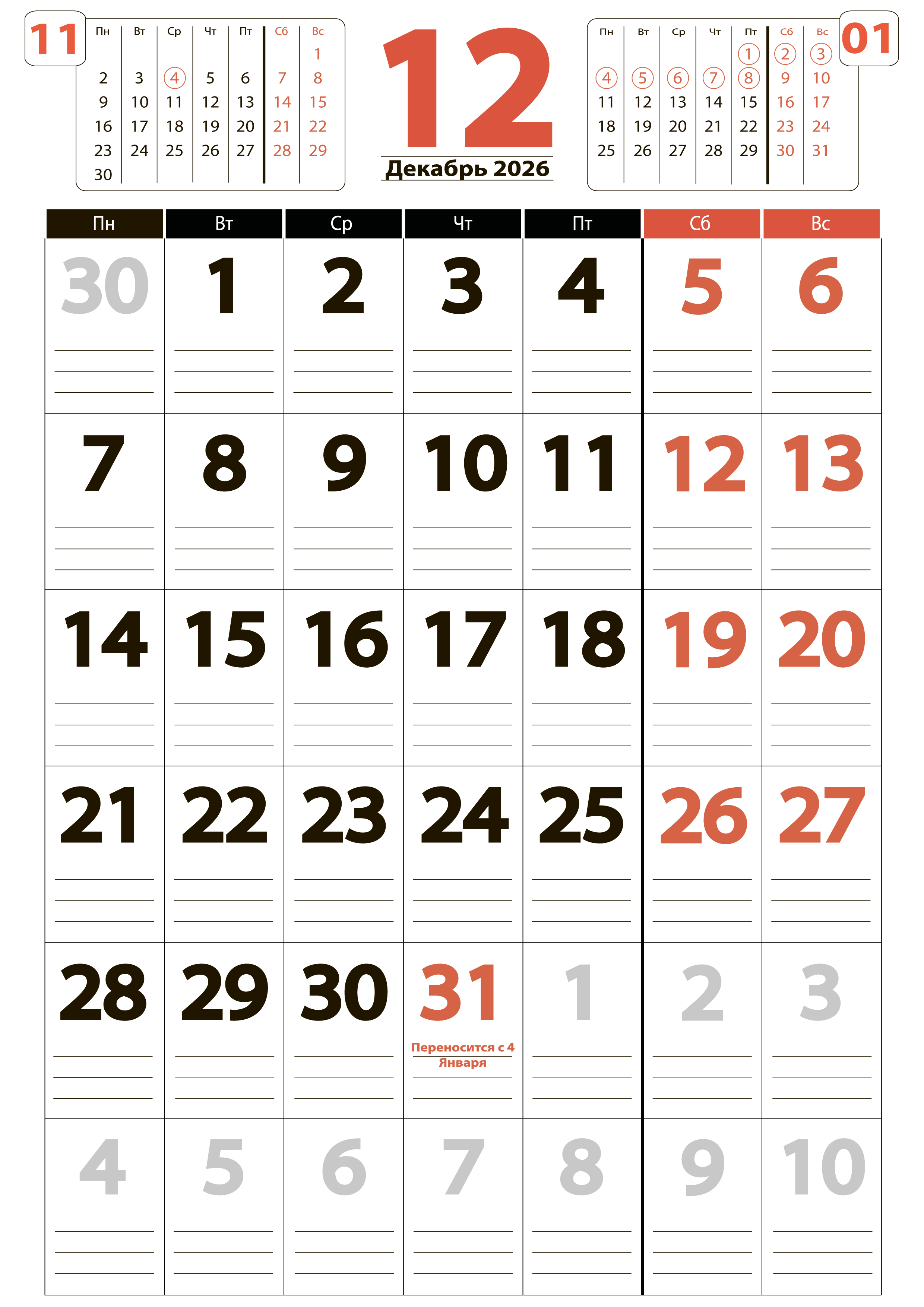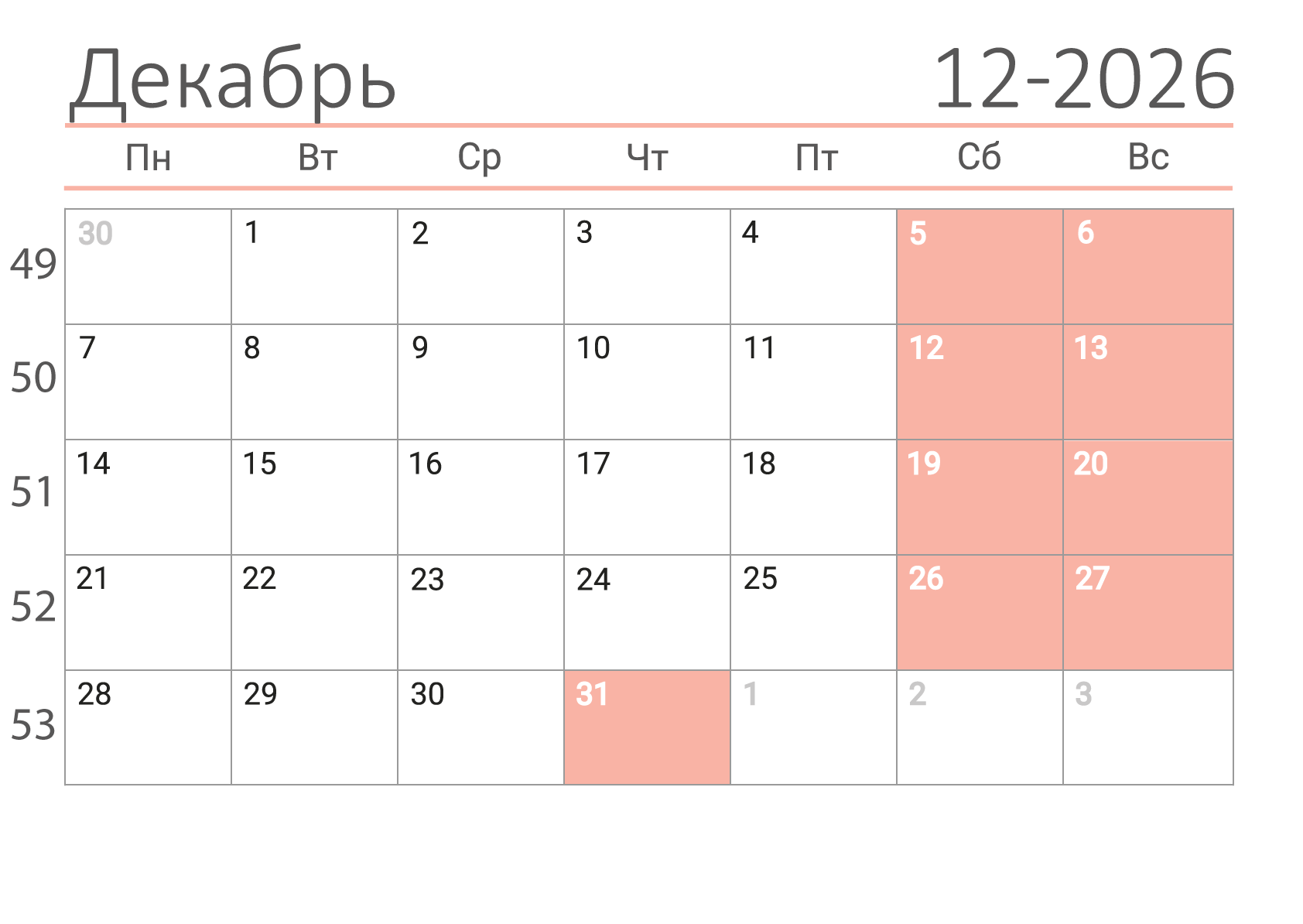 Для скачивания календаря на декабрь подготовлено четыре вида: обычный, вертикальный, сеткой и большой. Все календари представлены в формате png, в высоком разрешении, совершенно бесплатно. Скачав, можете распечатать или поставить на заставку.