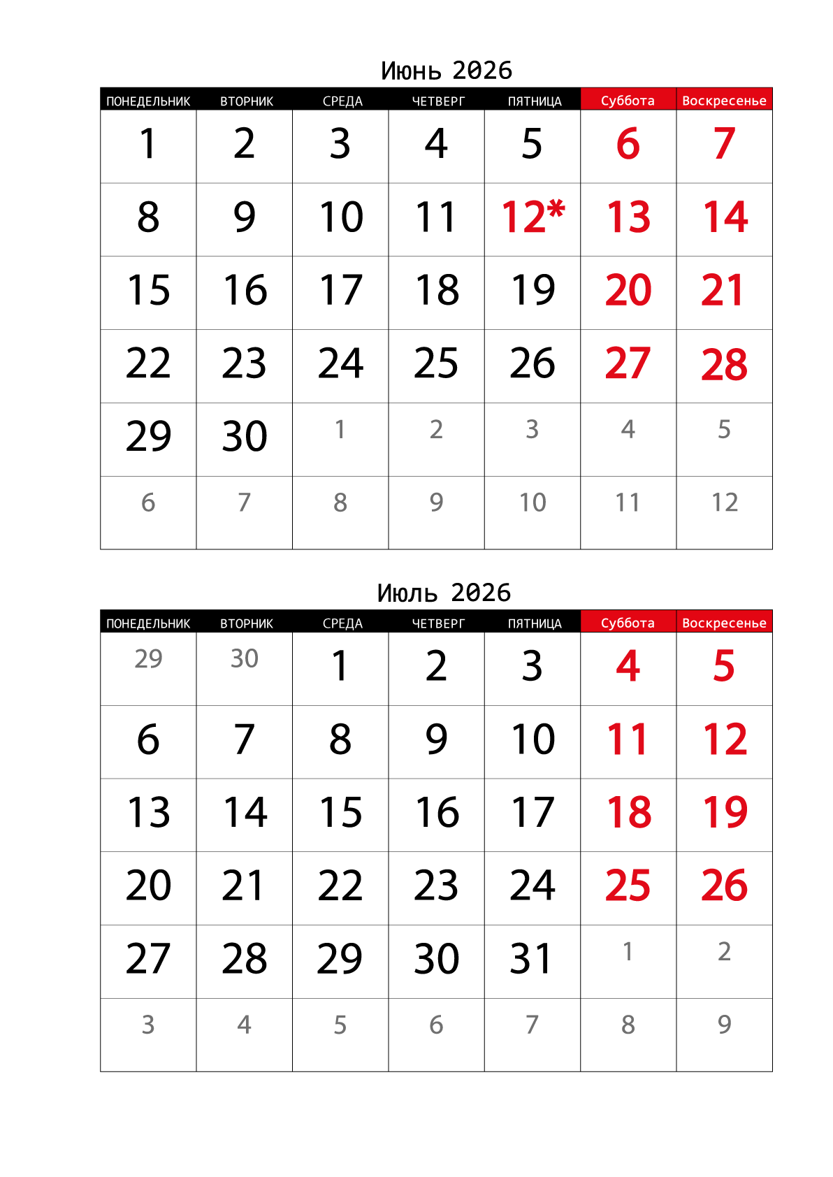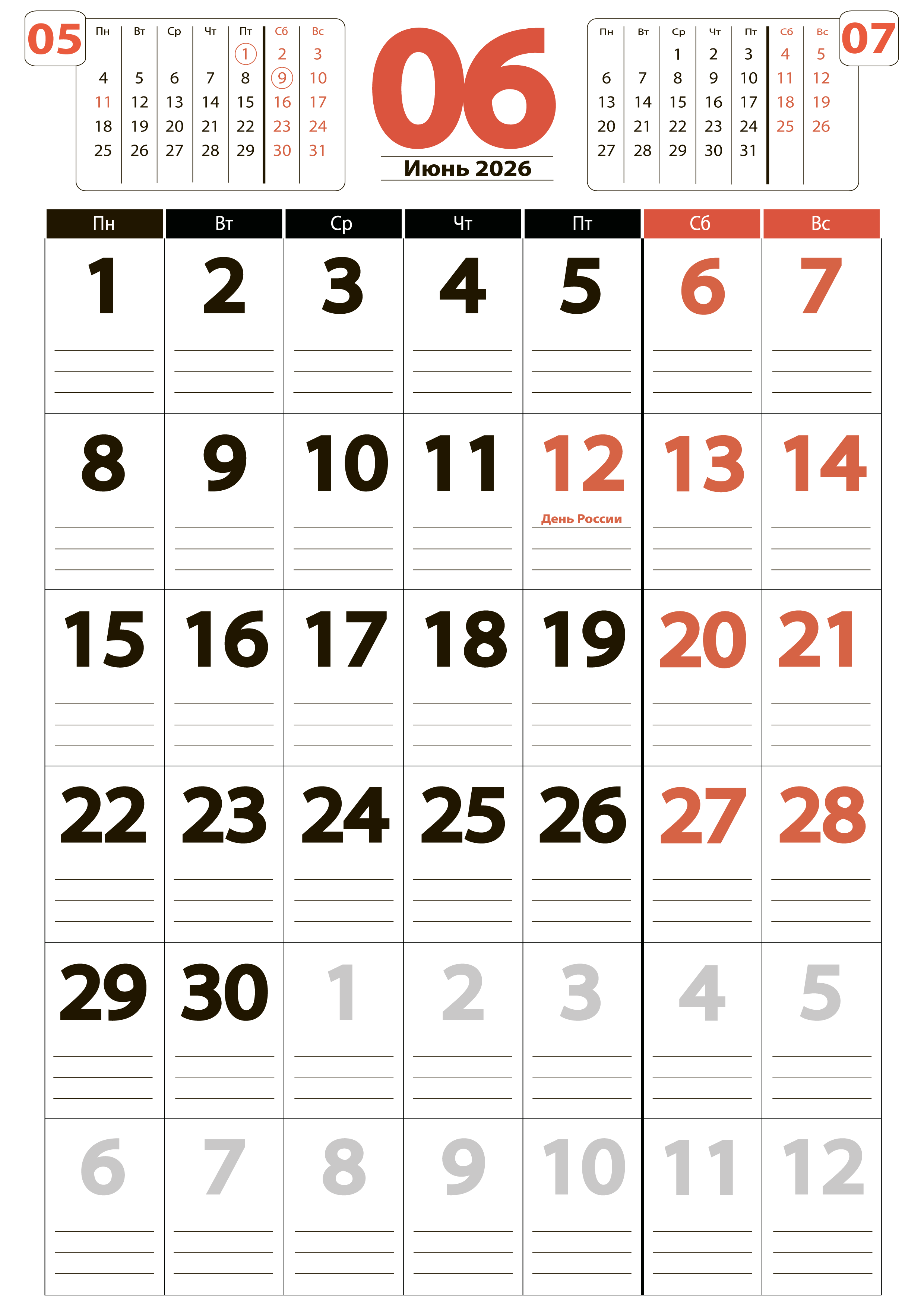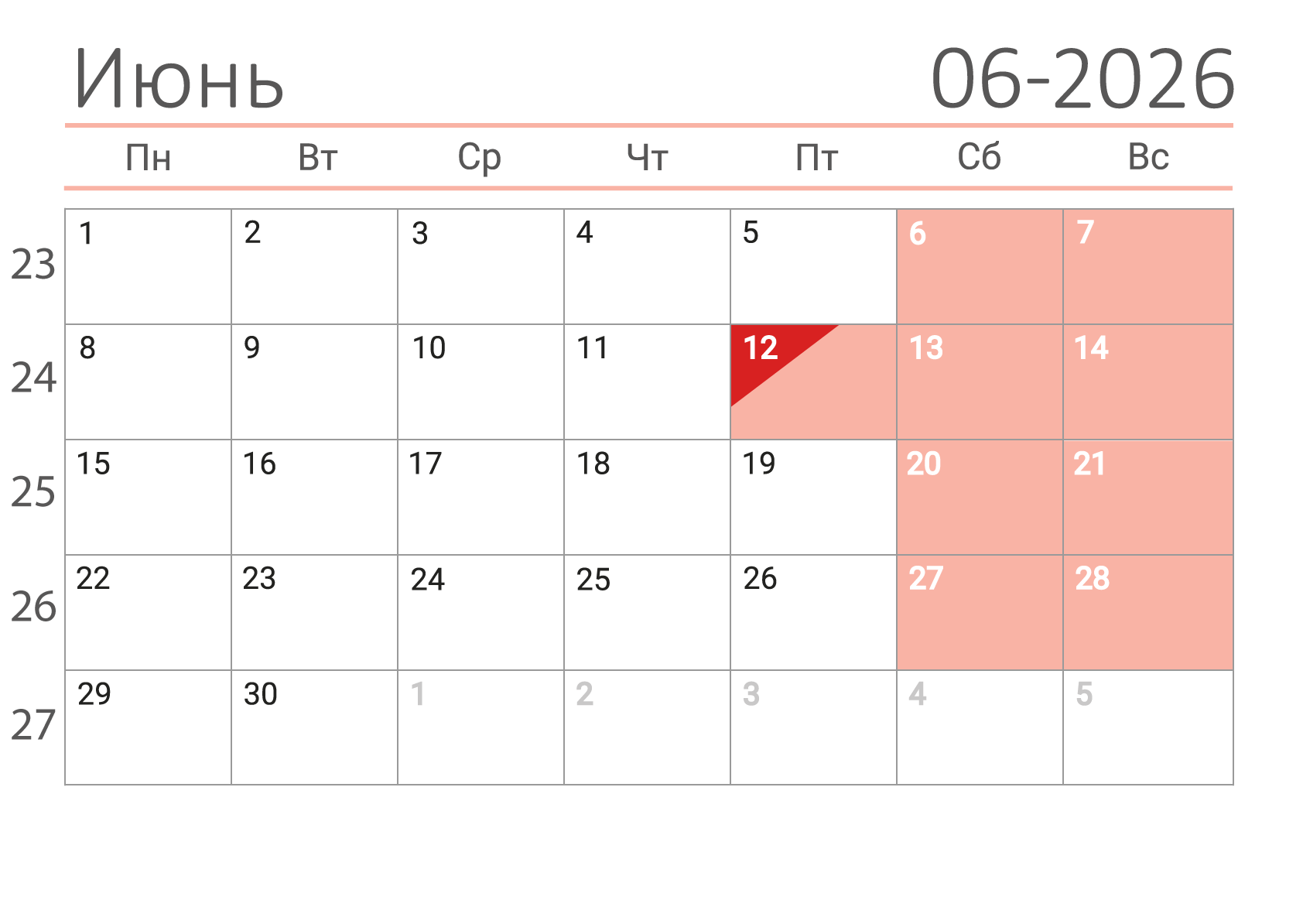 Для скачивания календаря на июнь подготовлено четыре вида: обычный, вертикальный, сеткой и большой. Все календари представлены в формате png, в высоком разрешении, совершенно бесплатно. Скачав, можете распечатать или поставить на заставку.