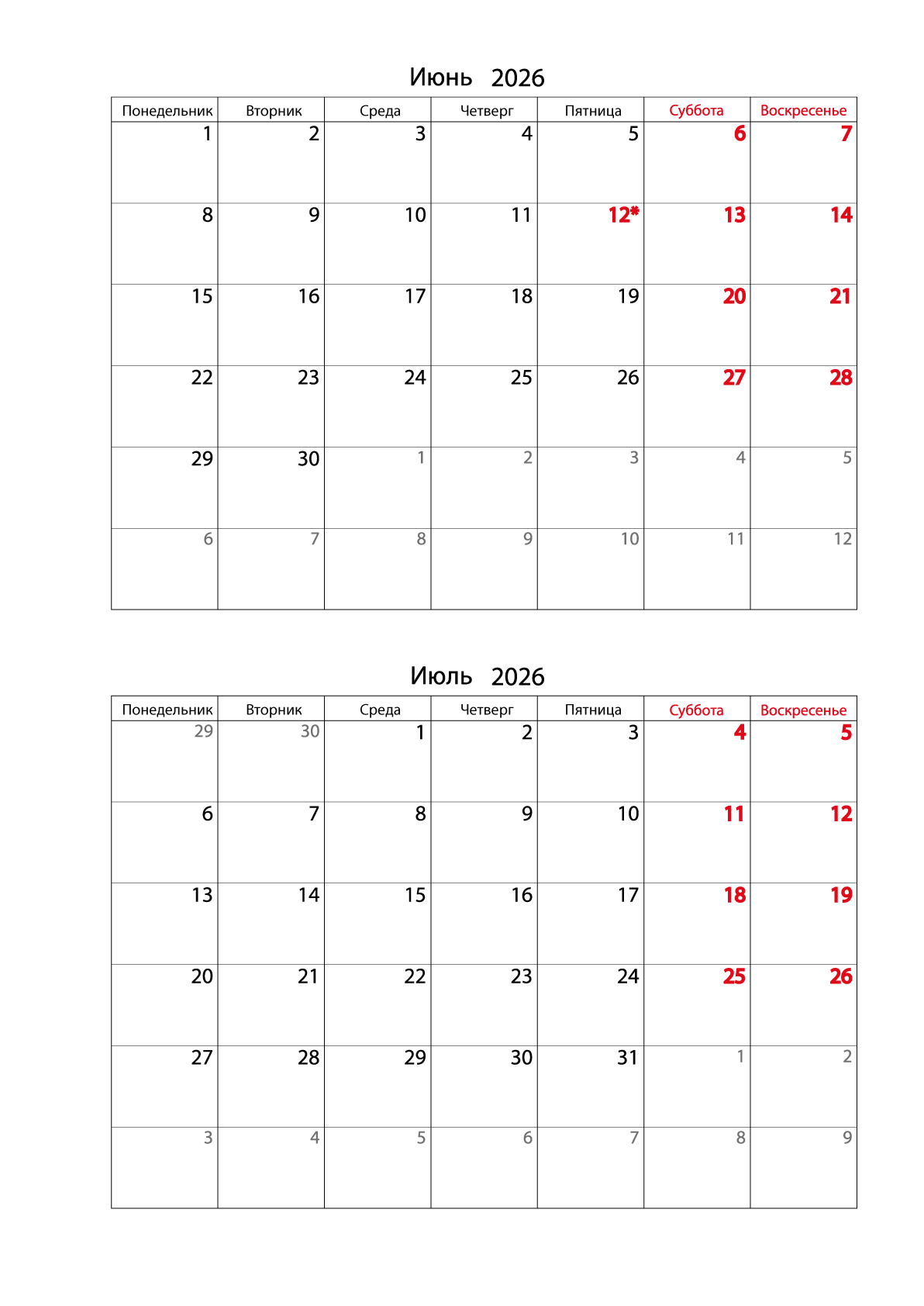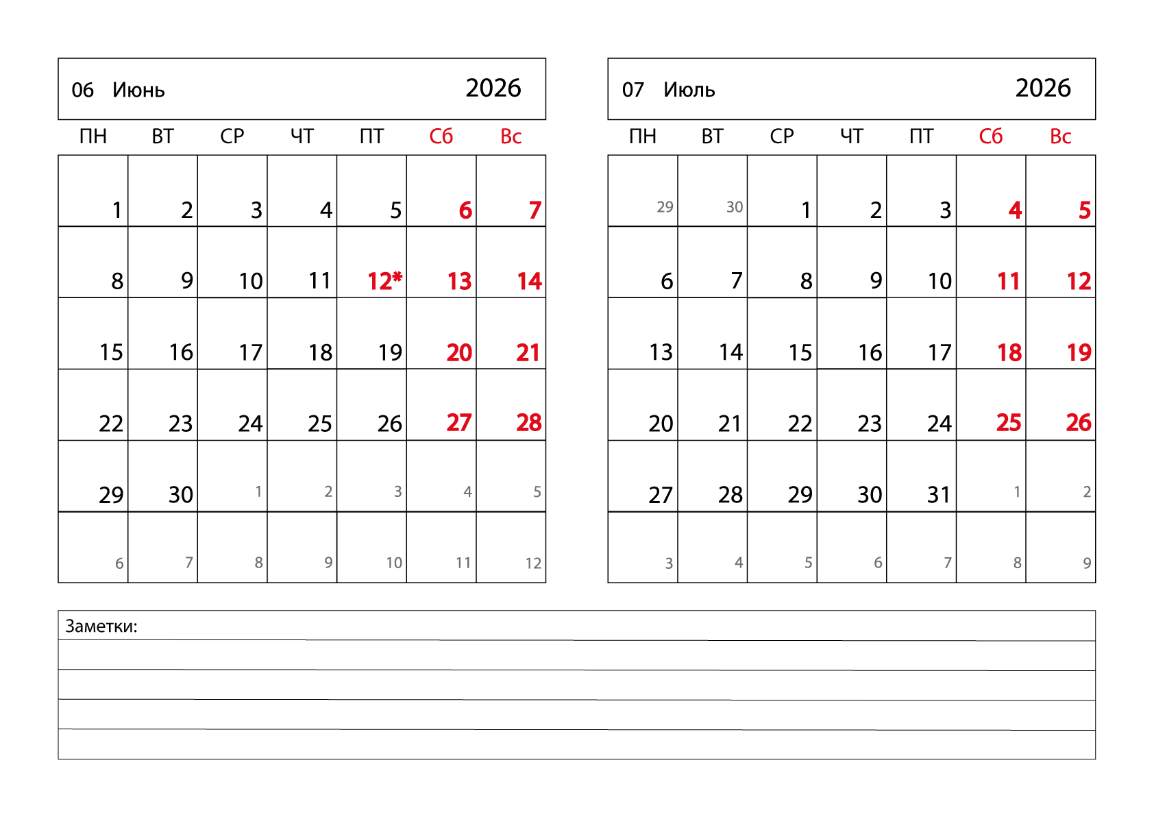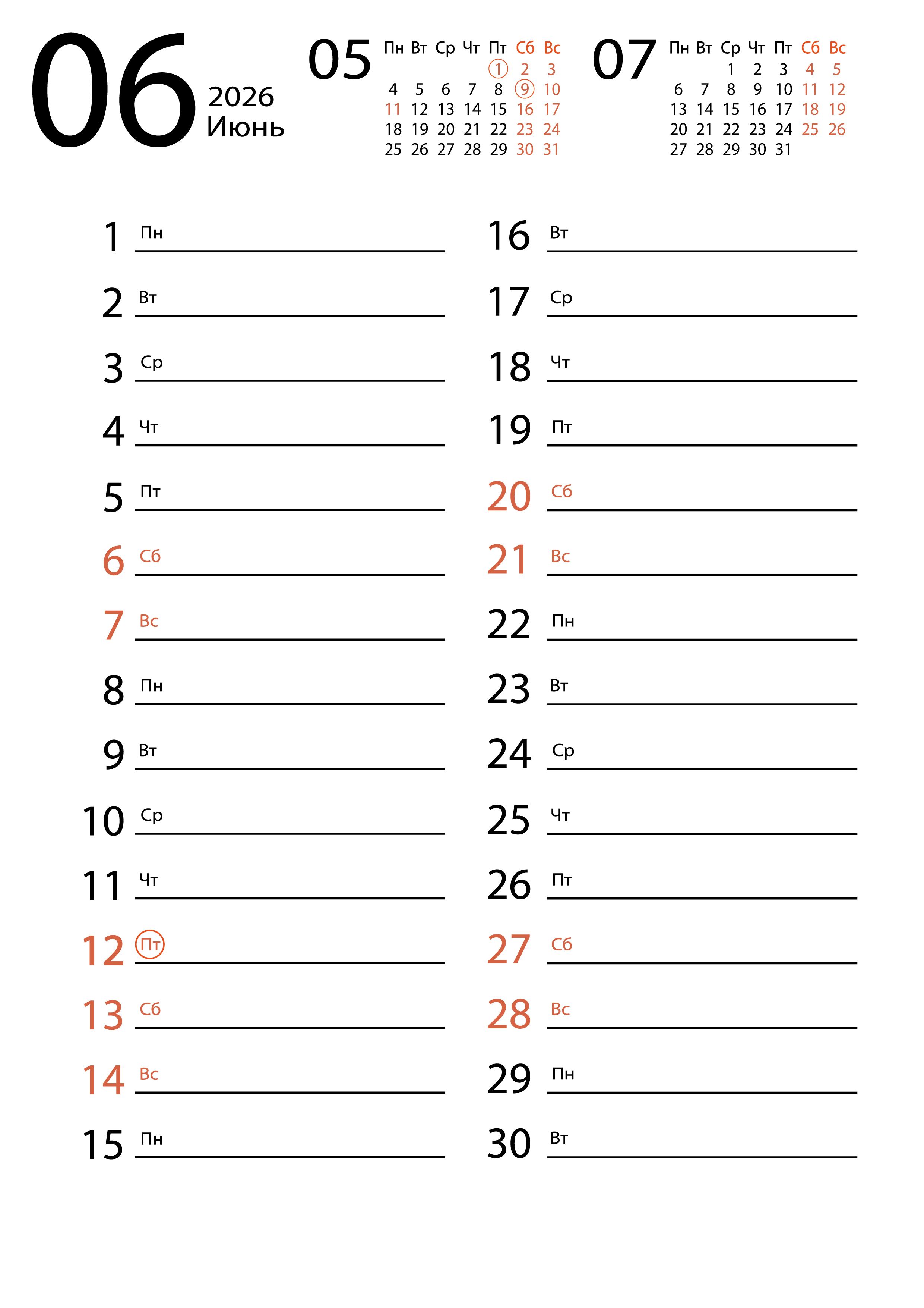 Для скачивания календаря на июнь подготовлено четыре вида: обычный, вертикальный, сеткой и большой. Все календари представлены в формате png, в высоком разрешении, совершенно бесплатно. Скачав, можете распечатать или поставить на заставку.